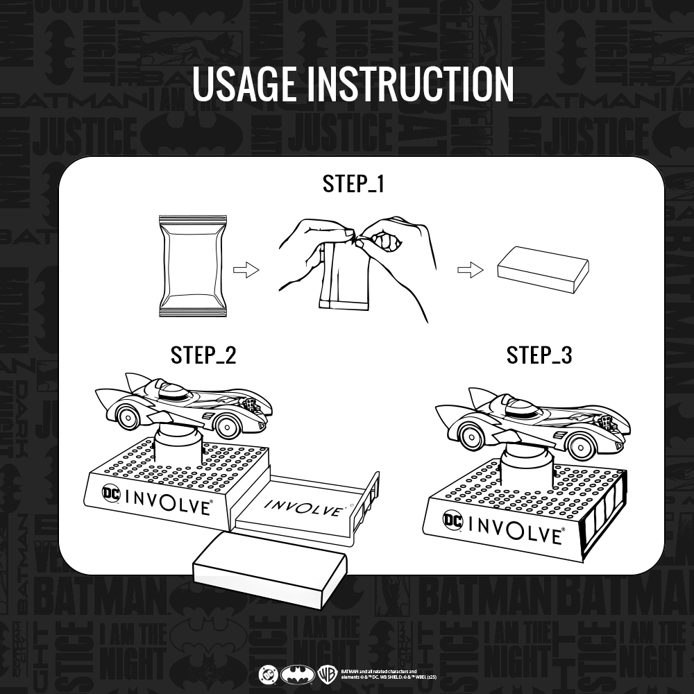 INCLUDED COMPONENTS: 1 PC of Batmobile Display Unit + 2 PC of Round Sticker + 2 PC of Fragrance Pad + 1 Double Sided Tape.
