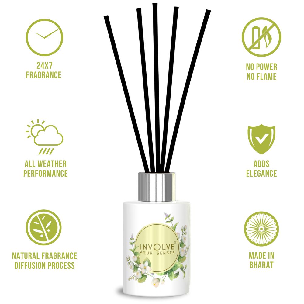 INCLUDED COMPONENTS: Involve One Glass Bottle Diffuser Oil + 5 x Reed Sticks