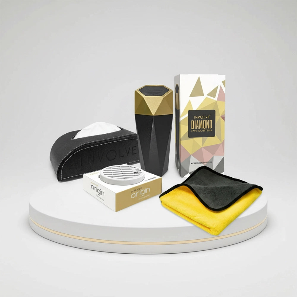 INCLUDED COMPONENTS: Involve Origin Air Freshener + 1 Double Tape + Involve Car Dustbin + Involve Leather Tissue Box + 2 Ply Tissue + Involve Microfiber Cloth